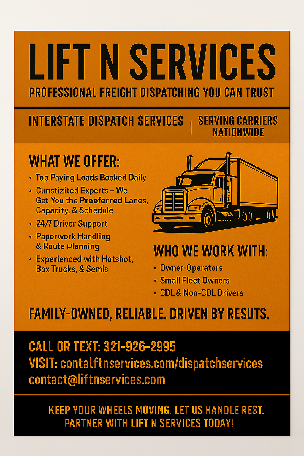 At Lift N Services, we’re more than just a dispatching company — we’re your freight movement partner. Built by carriers, for carriers, our dispatch services are tailored to support the real-life demands of owner-operators and small fleets running flatbeds, dry vans, hot shots, and box trucks across state lines.